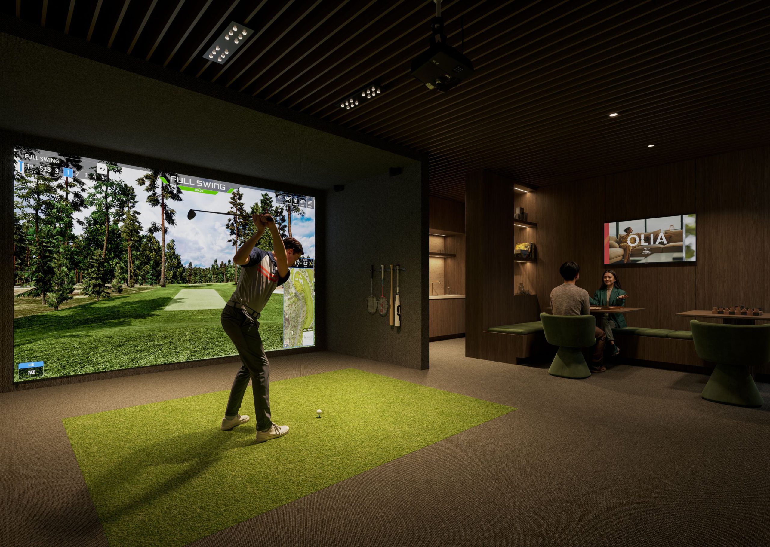 The Sports and Game Lounge at Club Olia welcomes residents into a vibrant atmosphere for entertainment and engagement. The modern lounge includes a wet bar, sound system, and a Full Swing simulator programmed with over 50 sports games.